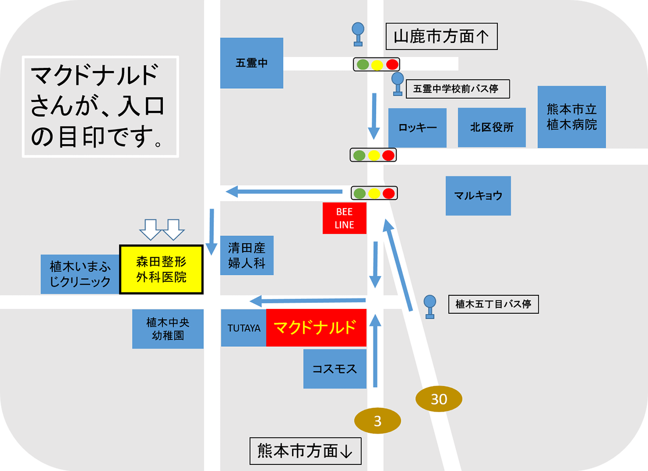 チョイソコ くまもと植木」という「予約制の乗合タクシー」の停留所に指定されていますので当院で乗り降りできます。